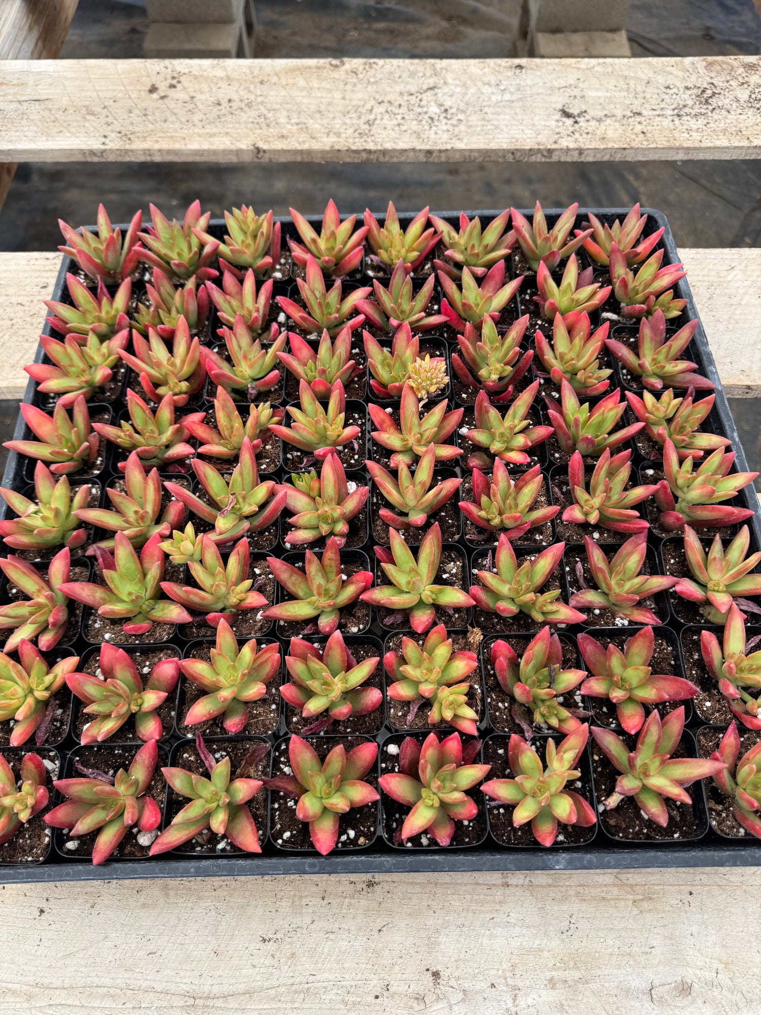 64 healthy Sedum ‘Firestorm’ plants, each fully rooted in a 2” nursery pot. Expect brighter red tones with stronger sunlight.