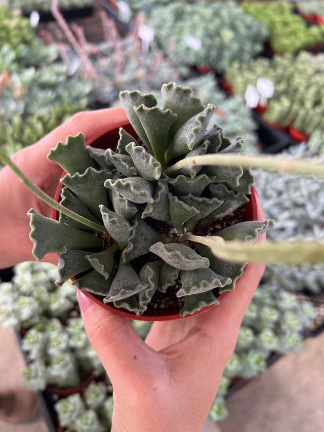 The Adromischus cristatus is compact, low-maintenance succulent known for its thick, crinkled green leaves resembling a pie crust. This drought-tolerant succulent thrives indoors and outdoors, making it a great addition to small pots, succulent arrangements, and decorative displays.