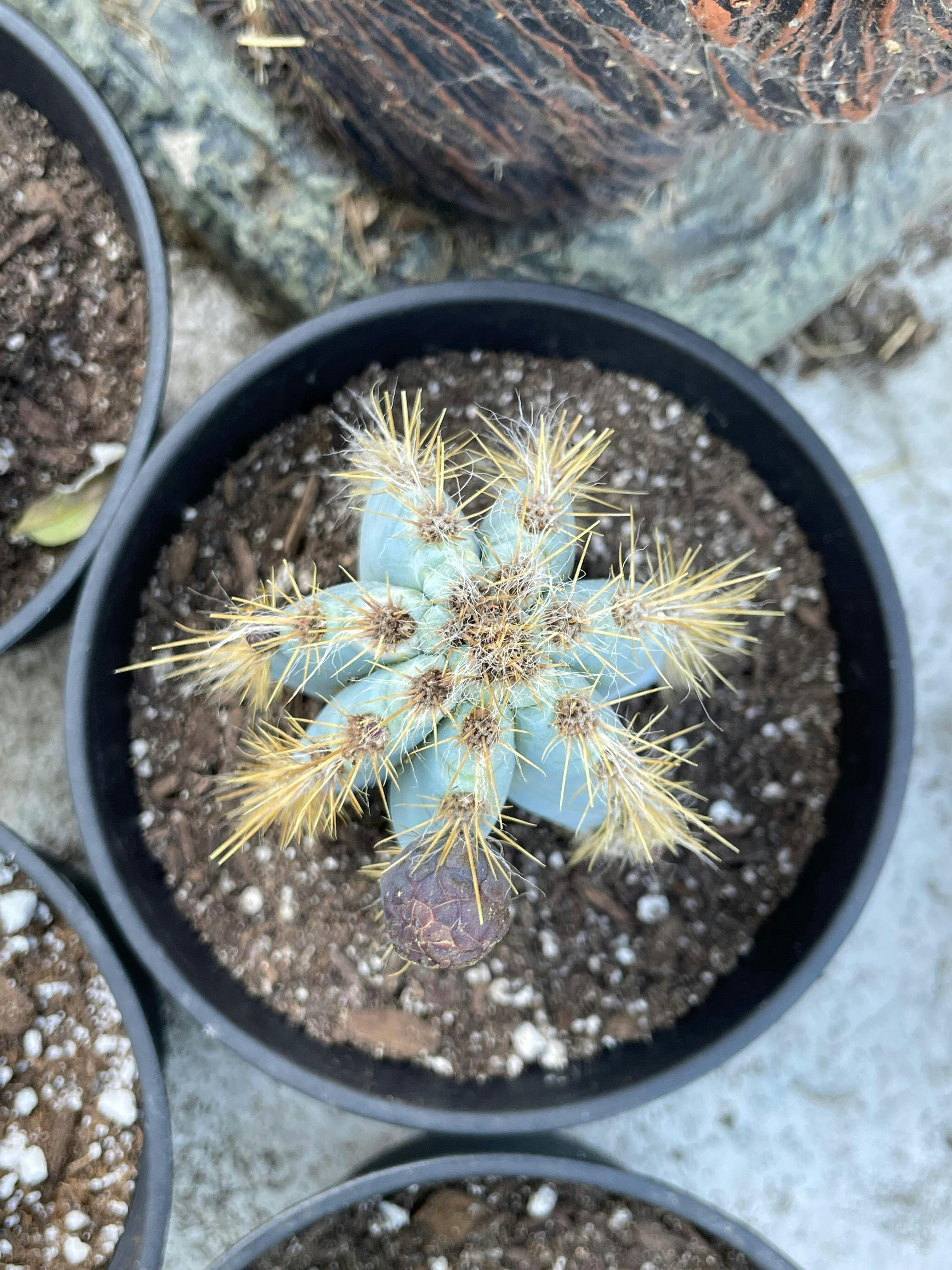 Pilosocereus azureus is prized for its rich blue skin that gets brighter with strong light. The ribs are neatly lined with golden spines, giving striking contrast. It grows quickly with heat and sun, making it a great statement plant for bright windows, patios, or warm gardens in frost-free areas. With the right care, your cutting will root and take off.