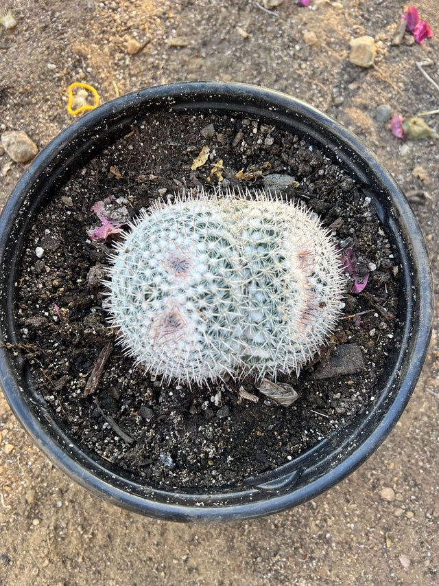 This unique Owl's Eye Mammillaria features a striking split cluster with two heads, each with its own distinctive split. Measuring approximately 6 inches wide and 4 inches tall, it’s a rare and eye-catching specimen that would make a wonderful addition to any cactus collection.